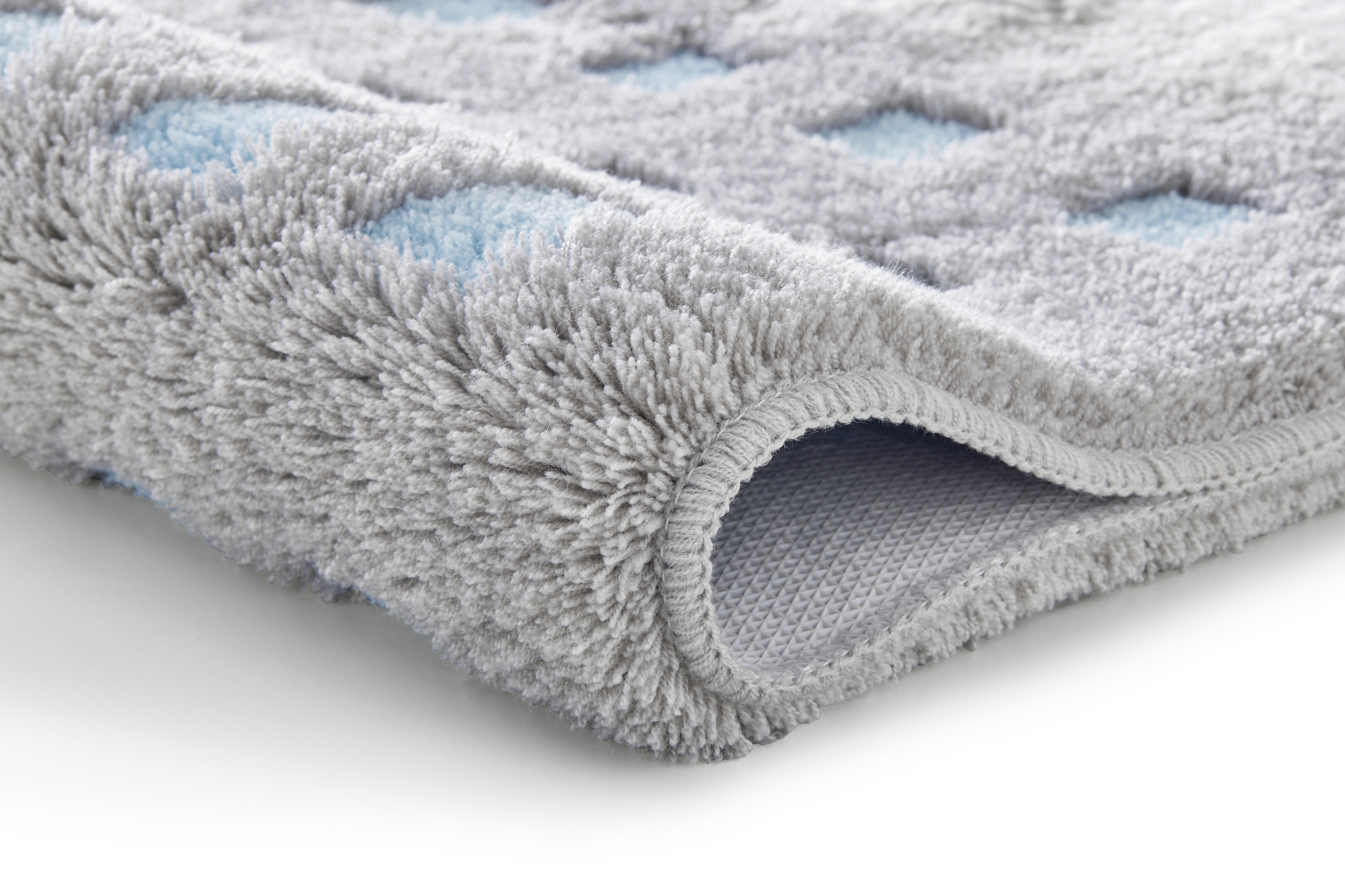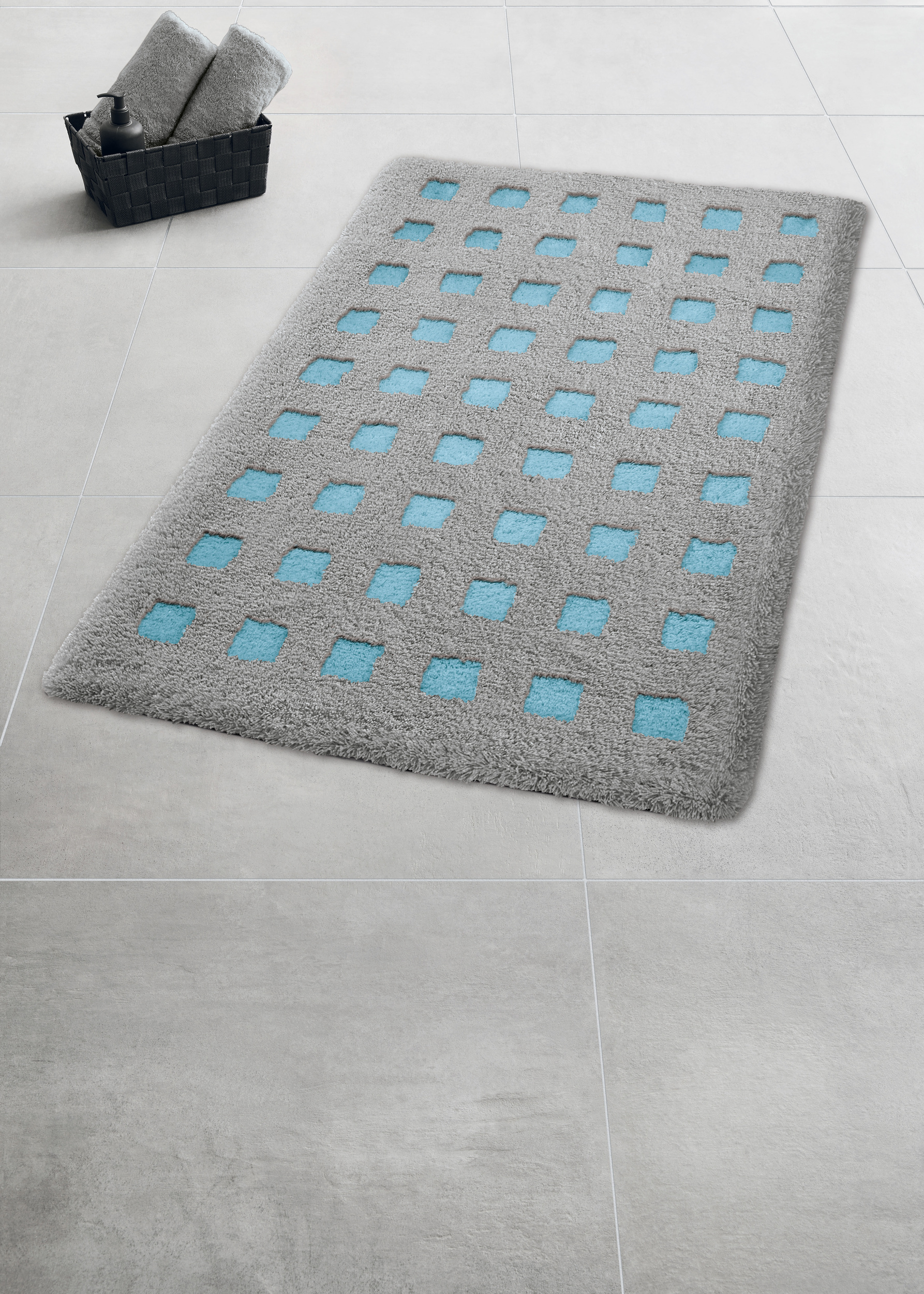 Erleben Sie den Badteppich BOXES in Opal, der mit seinen Maßen von 80 x 140 cm jedes Badezimmer bereichert. Die Kombination aus Eleganz und Komfort macht ihn zu einem unverzichtbaren Accessoire. Mit Florhöhen von 15 und 20 mm bietet er ein besonders weiches Trittgefühl. Gefertigt aus hochwertigem 100% Polyacryl, zeichnet sich der Teppich durch seine Langlebigkeit und einfache Pflege aus – er ist maschinenwaschbar bei 40°C im Schonwaschgang und kann bei niedriger Temperatur im Trockner getrocknet werden. Die rutschhemmende Unterseite sorgt für Sicherheit, während die Eignung für Fußbodenheizungen den Teppich vielseitig einsetzbar macht. Sein modernes Design mit einem grauen Hintergrund und hellblauen Quadraten verleiht jedem Raum eine frische, moderne Ausstrahlung.