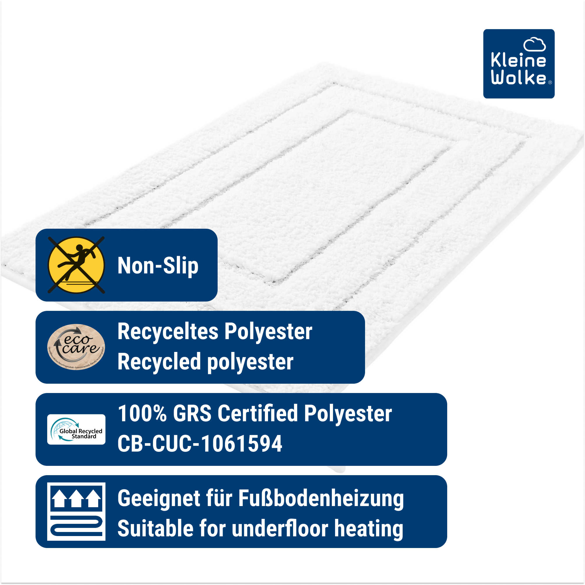 Der Badteppich Nico in Weiß besticht durch seine flauschige und weiche Oberfläche, die ein angenehmes Laufgefühl im Badezimmer schafft. Sein dezentes Hoch-Tief Muster, bestehend aus zwei rechteckigen Rahmen, verleiht ihm eine zeitlos elegante Ausstrahlung, die sich nahtlos in jedes Badezimmer einfügt. Gefertigt aus 100% Polyester, zeichnet sich der Teppich durch seine Pflegeleichtigkeit und Strapazierfähigkeit aus. Eine rutschhemmende Unterseite gewährleistet sicheren Halt auf dem Boden. Der Teppich ist zudem OEKO-TEX Standard 100 zertifiziert, was bedeutet, dass er auf Schadstoffe geprüft wurde. Er ist für Fußbodenheizungen geeignet und lässt sich problemlos bei etwa 40° im Schonwaschgang reinigen und kann auch im Wäschetrockner getrocknet werden. Da er aus recycelten Materialien hergestellt ist, bietet der Badteppich Nico nicht nur Komfort, sondern auch einen Beitrag zur Nachhaltigkeit.