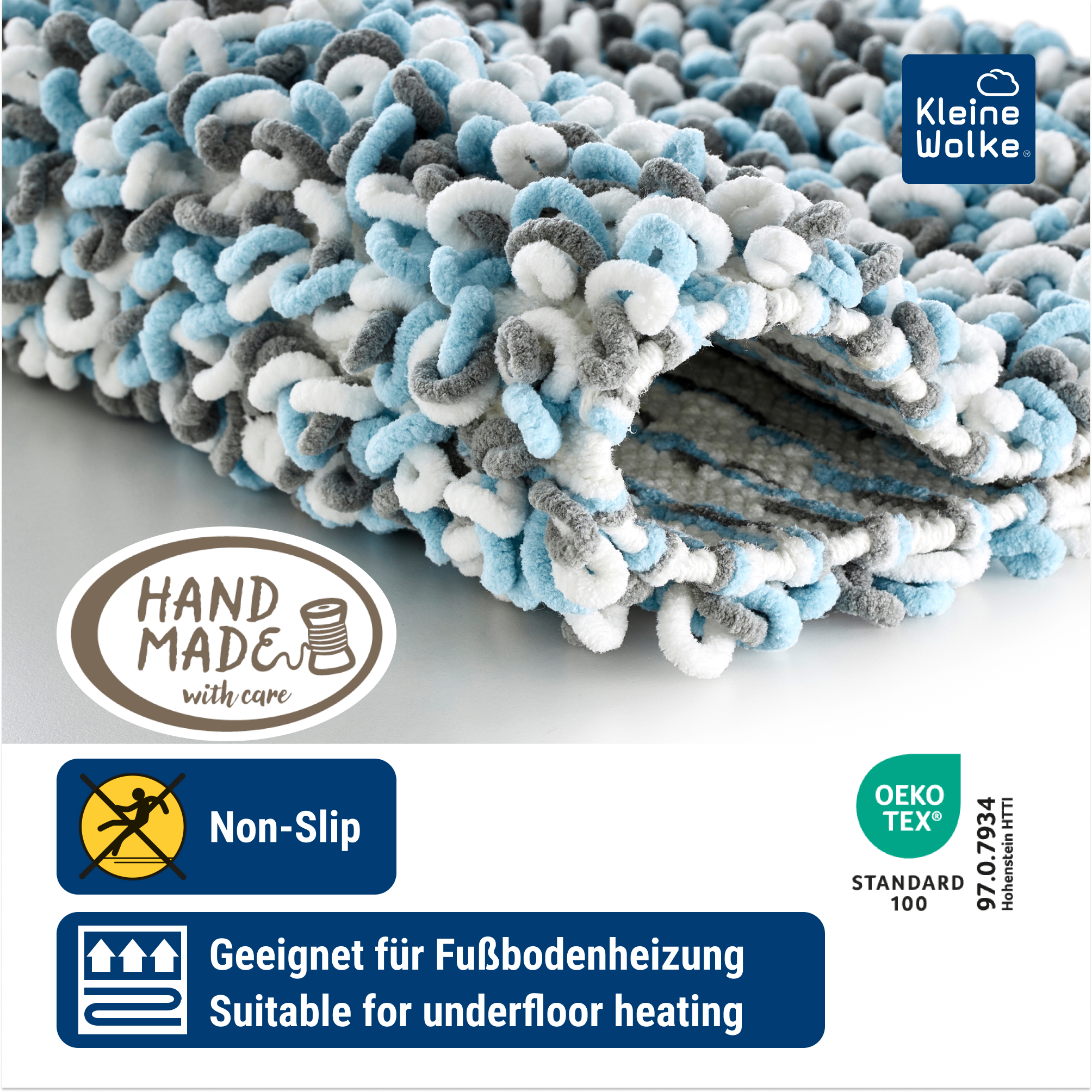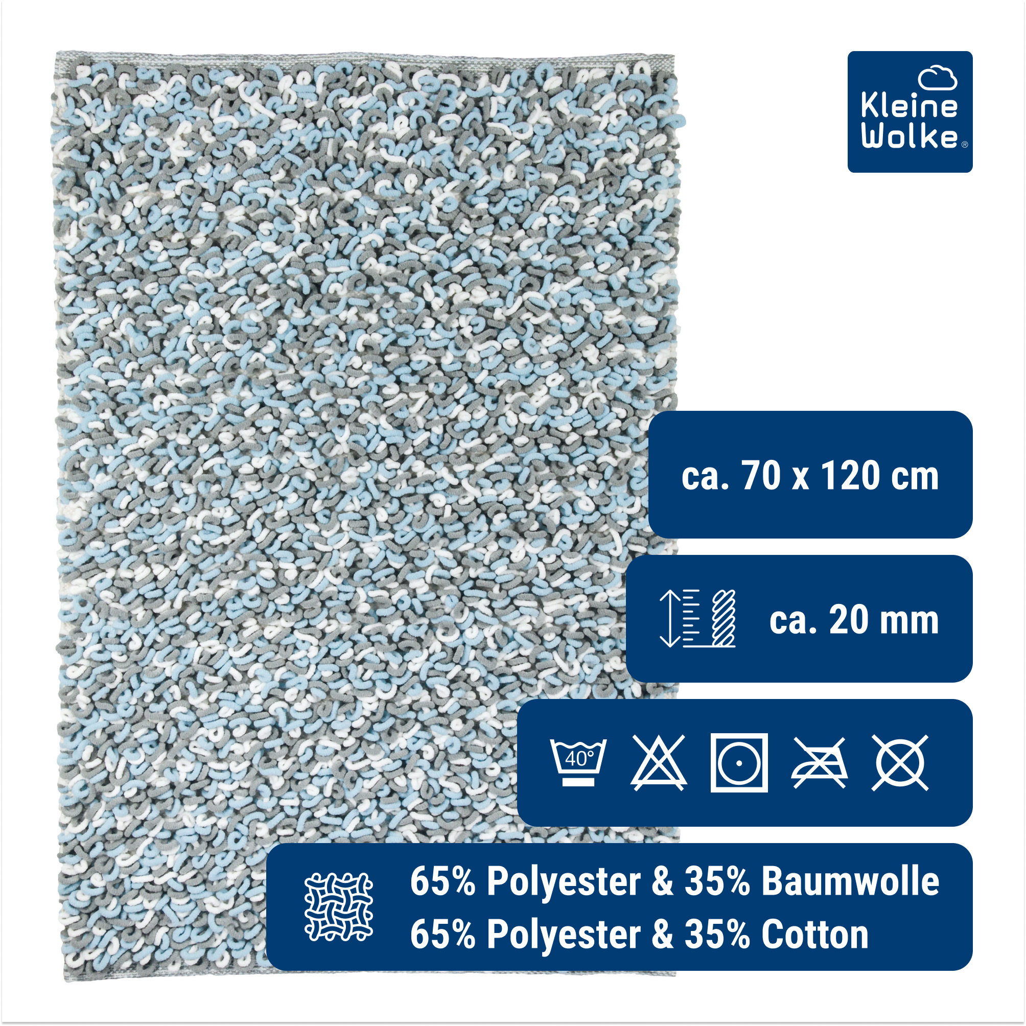 Erleben Sie den luxuriösen Komfort und die stilvolle Ausstrahlung des Badteppichs SLING in der ansprechenden Opalfarbe. Mit seinen Maßen von 70 x 120 cm und einer Florhöhe von 20 mm bietet dieser Teppich ein außergewöhnlich weiches Gefühl unter Ihren Füßen. Die Kombination aus 65% Polyester und 35% Baumwolle garantiert sowohl Haltbarkeit als auch einfache Pflege. Dank der Oeko-Tex Standard 100 Zertifizierung können Sie sicher sein, dass der Teppich frei von schädlichen Chemikalien ist. Eine rutschfeste Unterseite bietet zusätzliche Stabilität auf nassen Badezimmerböden, während die Eignung für Fußbodenheizungen zusätzlichen Komfort verspricht. Das dichte, flauschige Design mit einer ansprechenden Mischung aus hellblauen und grauen Tönen sowie die weichen Schlaufen machen jeden Schritt zu einem puren Vergnügen.
