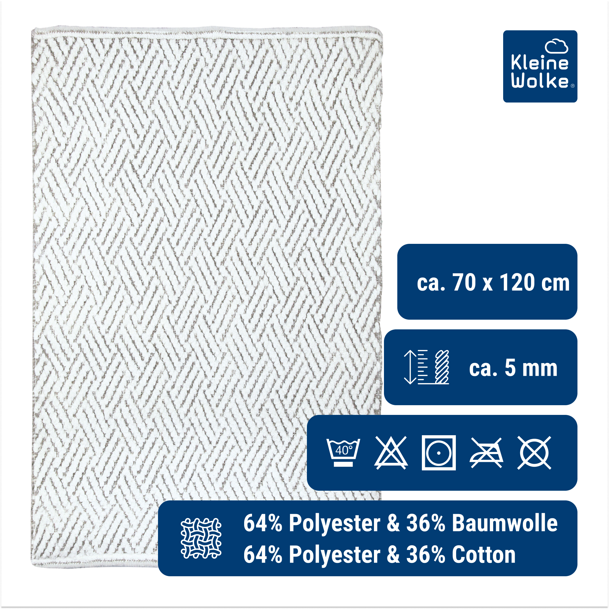 Erleben Sie den stilvollen Badteppich SWITCH in der Nuance Macadamia, eine perfekte Ergänzung für Ihr Badezimmer. Dieser Teppich hat die Maße 70 cm Breite und 120 cm Länge und bietet mit einer Florhöhe von 5 mm ein angenehmes Laufgefühl. Gefertigt aus einer Mischung von 64% Polyester und 36% Baumwolle, zeichnet sich der Teppich durch seine Strapazierfähigkeit und einfache Pflege aus. Er ist maschinenwaschbar bei 40°C im Schonwaschgang und trocknergeeignet bei niedriger Temperatur. Außerdem ist er für Räume mit Fußbodenheizung geeignet, was seine Flexibilität unterstreicht. Das quadratische Design mit einem ansprechenden geometrischen Muster in Weiß und Beige verleiht jedem Badezimmer einen modernen, eleganten Touch. Der Badteppich ist zudem nach Oeko-Tex Standard 100 zertifiziert, was seine Umweltfreundlichkeit und gesundheitliche Unbedenklichkeit bestätigt.