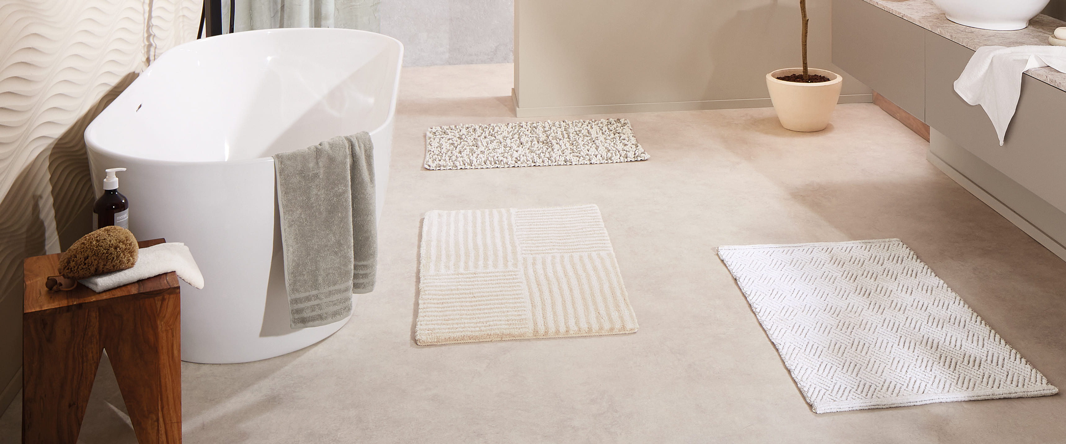 Die weichen Badteppiche verleihen dem Badezimmer eine angenehme Atmosphäre. Diese weichen Oberflächen tragen dazu bei, dass das Badezimmer nicht nur visuell, sondern auch haptisch als harmonischer und entspannender Rückzugsort empfunden wird.
