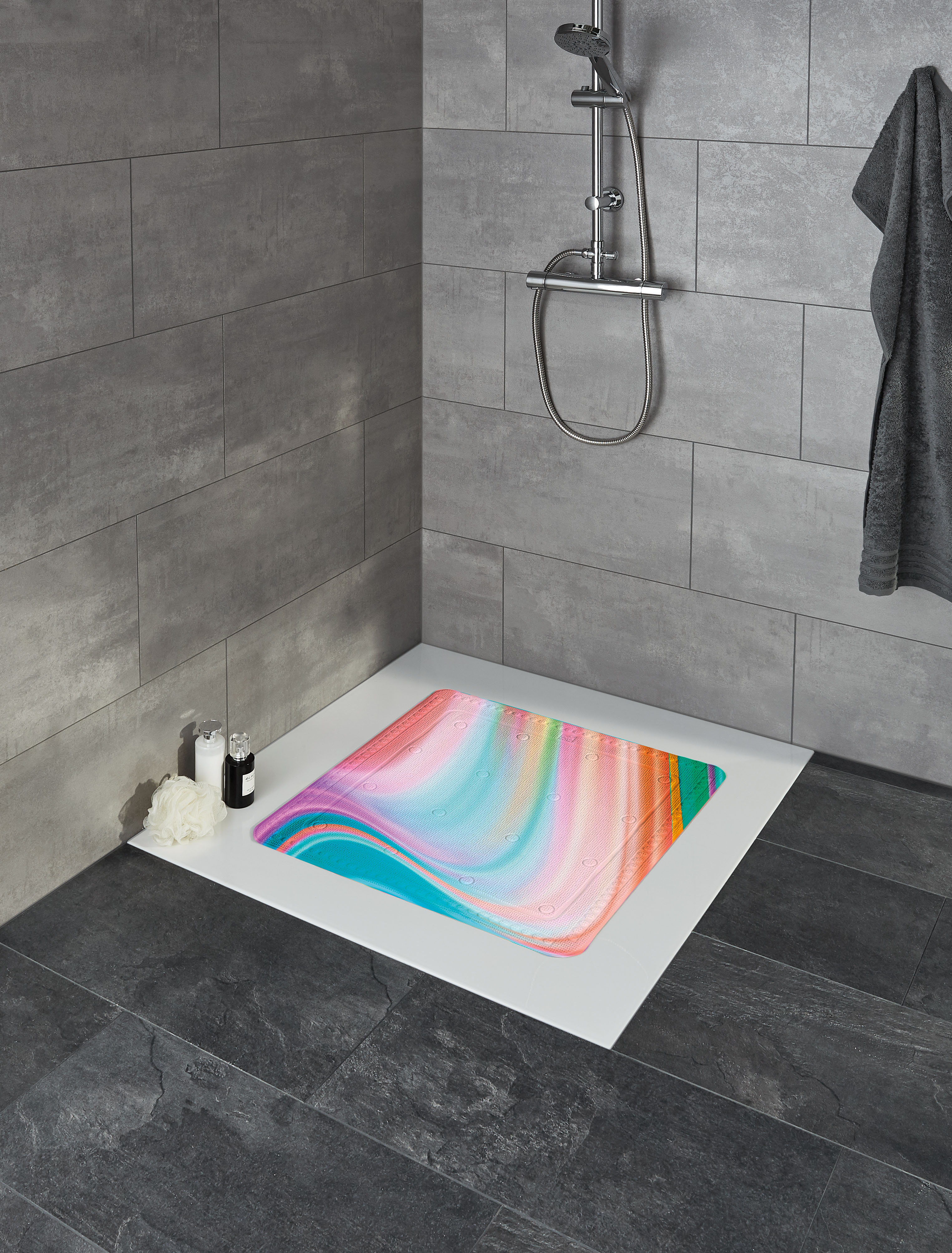 Entdecken Sie die Duscheinlage "Vibes", ideal für den Einsatz in Ihrer Dusche. Diese Matte besticht durch ihr lebendiges und buntes Design mit einem wellenartigen Farbverlauf aus Rosa, Blau, Grün, Gelb und Orange sowie abgerundeten Rändern und kleinen kreisförmigen Mustern entlang der Kanten, die dem Produkt ein modernes und künstlerisches Aussehen verleihen. Gefertigt aus 100% PVC ist diese Matte nicht nur optisch ansprechend sondern auch praktisch im Gebrauch. Mit einer Größe von etwa 55 cm x 55 cm passt sie perfekt in jede Standarddusche und lässt sich leicht bei 40° im Schonwaschgang reinigen.