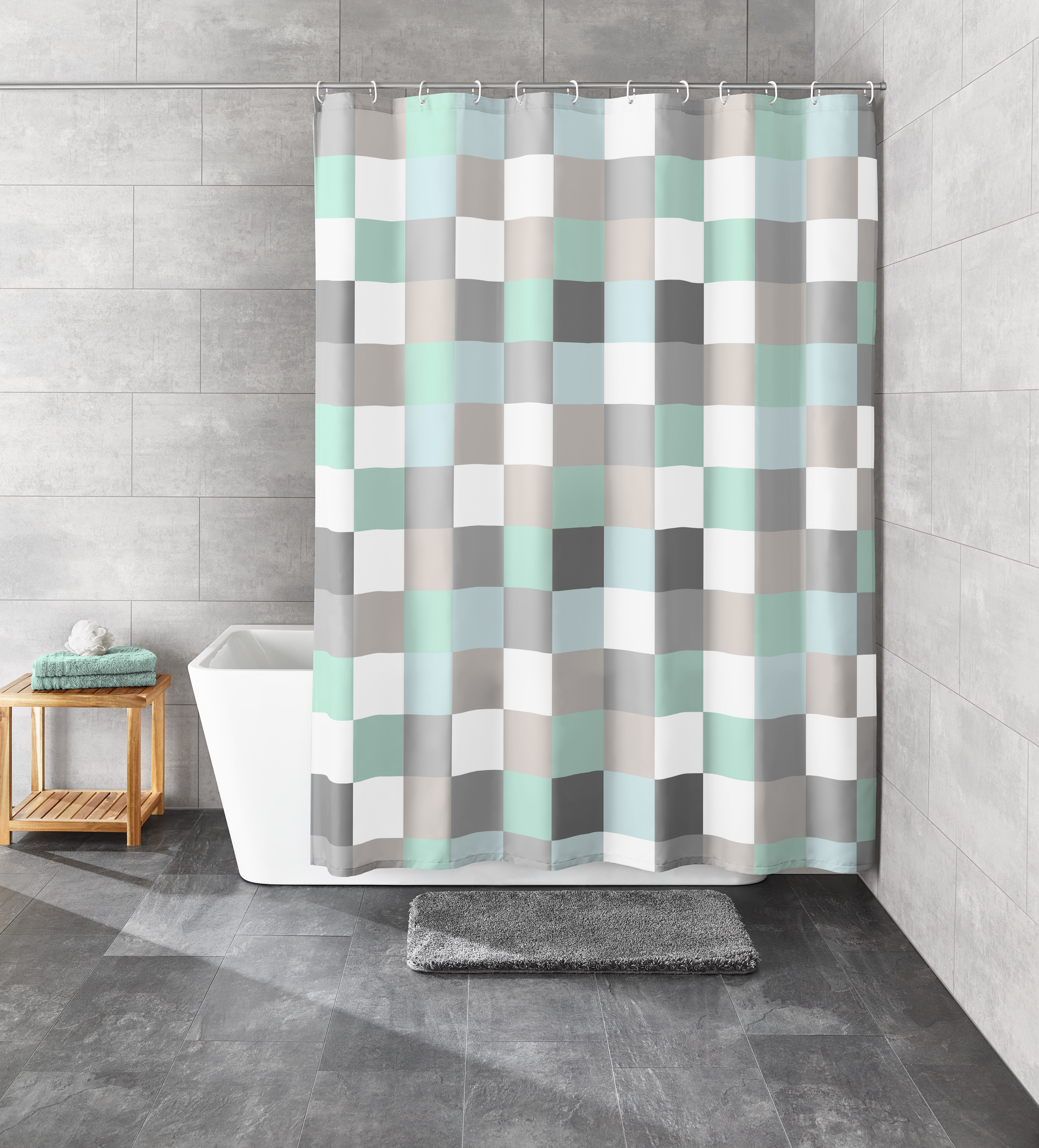Entdecken Sie den Duschvorhang "Mare" aus der Kollektion CHECK, der mit seinem ansprechenden karierten Muster in Blau-, Grau- und Weißtönen besticht. Die gleichmäßig angeordneten Quadrate verleihen Ihrem Badezimmer eine moderne und stilvolle Atmosphäre. Dieser hochwertige Vorhang ist aus 100% Polyester gefertigt und bietet dank seiner wasserabweisenden Eigenschaften optimalen Schutz gegen Spritzwasser. Die verstärkte Lochleiste mit stabilen Ösen sowie das Beschwerungsband im unteren Saum sorgen für eine ausgezeichnete Haltbarkeit und leichte Handhabung. Mit einer Breite von 120 cm und einer Länge von 200 cm passt dieser Duschvorhang ideal in die meisten Standardbäder.