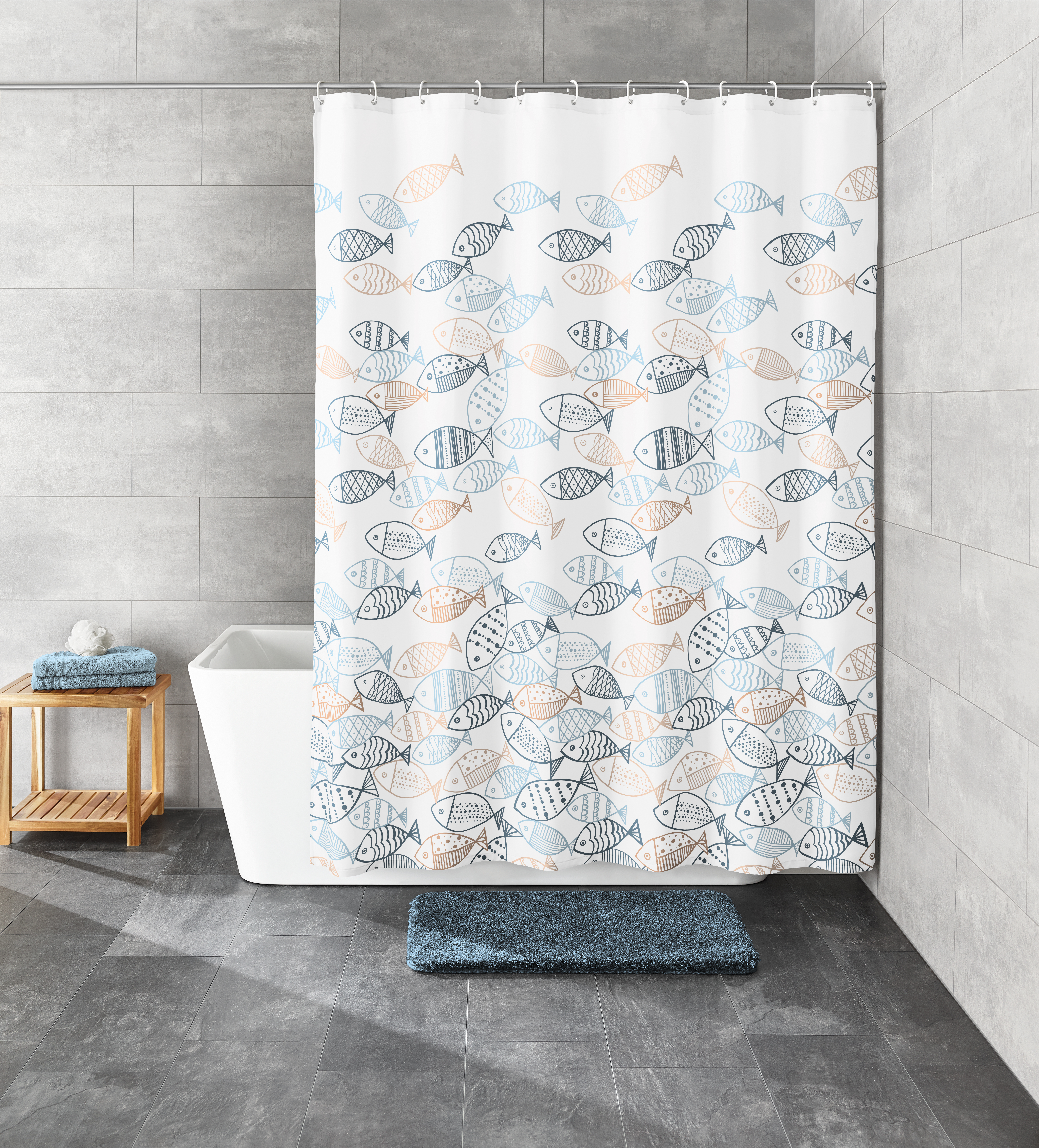 Verleihen Sie Ihrem Badezimmer einen frischen und lebendigen Look mit dem Duschvorhang "SARDINAS". Dieses Modell besticht durch sein ansprechendes Design mit stilisierten Fischen in den Farben Blau, Beige und Weiß auf einem weißen Hintergrund, das eine beruhigende Atmosphäre schafft. Gefertigt aus 100% Polyester, garantiert dieser Vorhang Langlebigkeit und einfache Pflege. Er ist maschinenwaschbar bei 40°C im Schonwaschgang und sollte nicht im Trockner getrocknet werden. Ein leichtes Bügeln bei niedriger Temperatur ist möglich. Der Duschvorhang ist zudem mit dem Oeko-Tex Standard 100 zertifiziert, was Ihnen versichert, dass er frei von schädlichen Substanzen ist. Die verstärkte Lochleiste mit stabilen Ösen sowie ein Beschwerungsband im unteren Saum sorgen für eine optimale Handhabung.