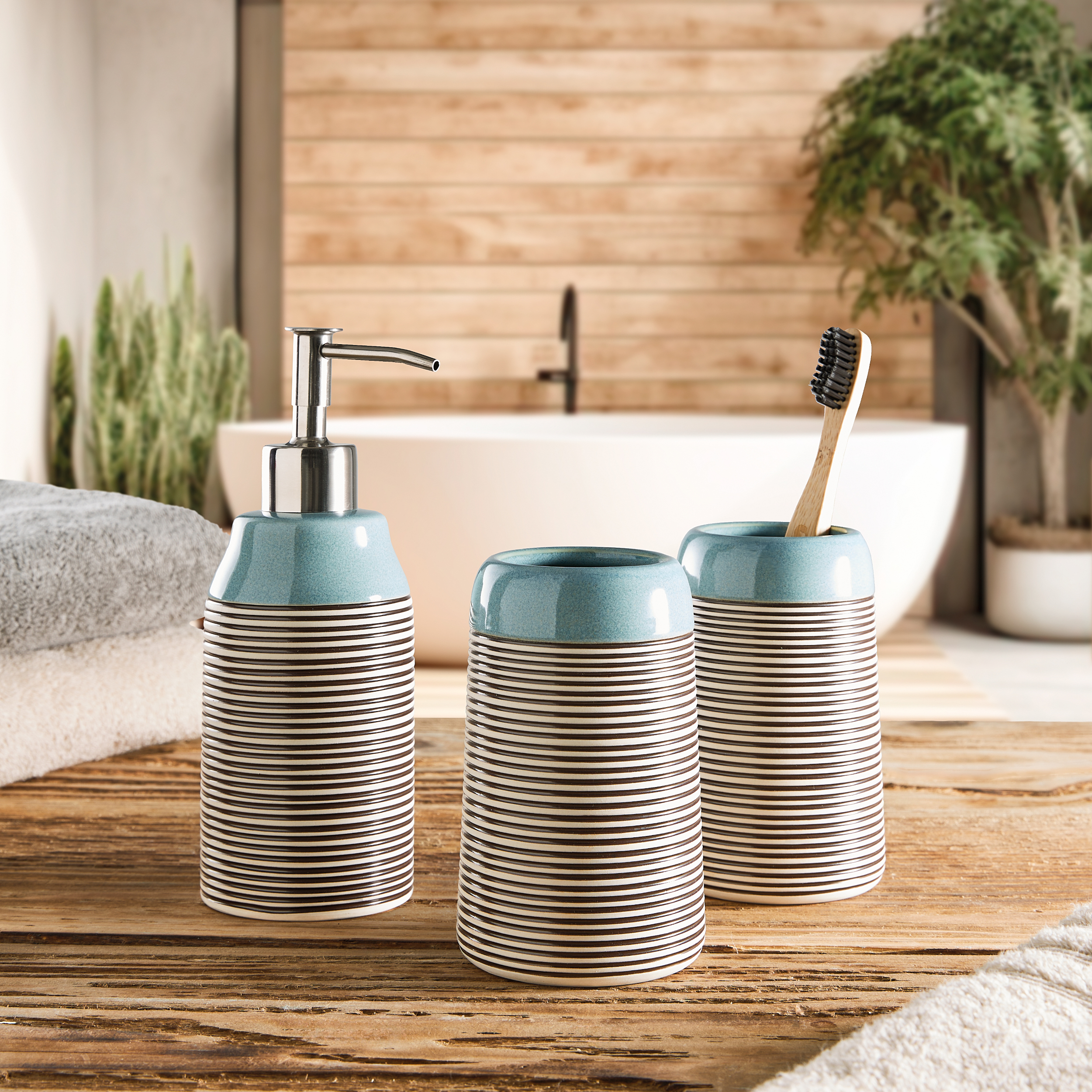 Entdecken Sie den OKAPI Seifenspender, ideal für jedes Badezimmer. Dieses Modell aus hochwertiger Keramik besticht durch sein ansprechendes Design in Mauritius-Farbe, das in einer jungen hand-made Optik mit eleganten Streifen gehalten ist. Der Seifenspender misst 7 cm in der Breite, 19 cm in der Höhe und 7 cm in der Tiefe, was ihm ein kompaktes und praktisches Format verleiht. Mit einem Fassungsvermögen von 310 ml bietet der Seifenspender ausreichend Platz für Ihre Lieblingsseife. Die integrierte Spenderpumpe ermöglicht eine perfekte Dosierung der Seife und trägt zur nachhaltigen Nutzung bei, da der Spender nachfüllbar ist. Bitte beachten Sie, dass dieser Seifenspender nicht für die Spülmaschine geeignet ist und von Hand gereinigt werden sollte.