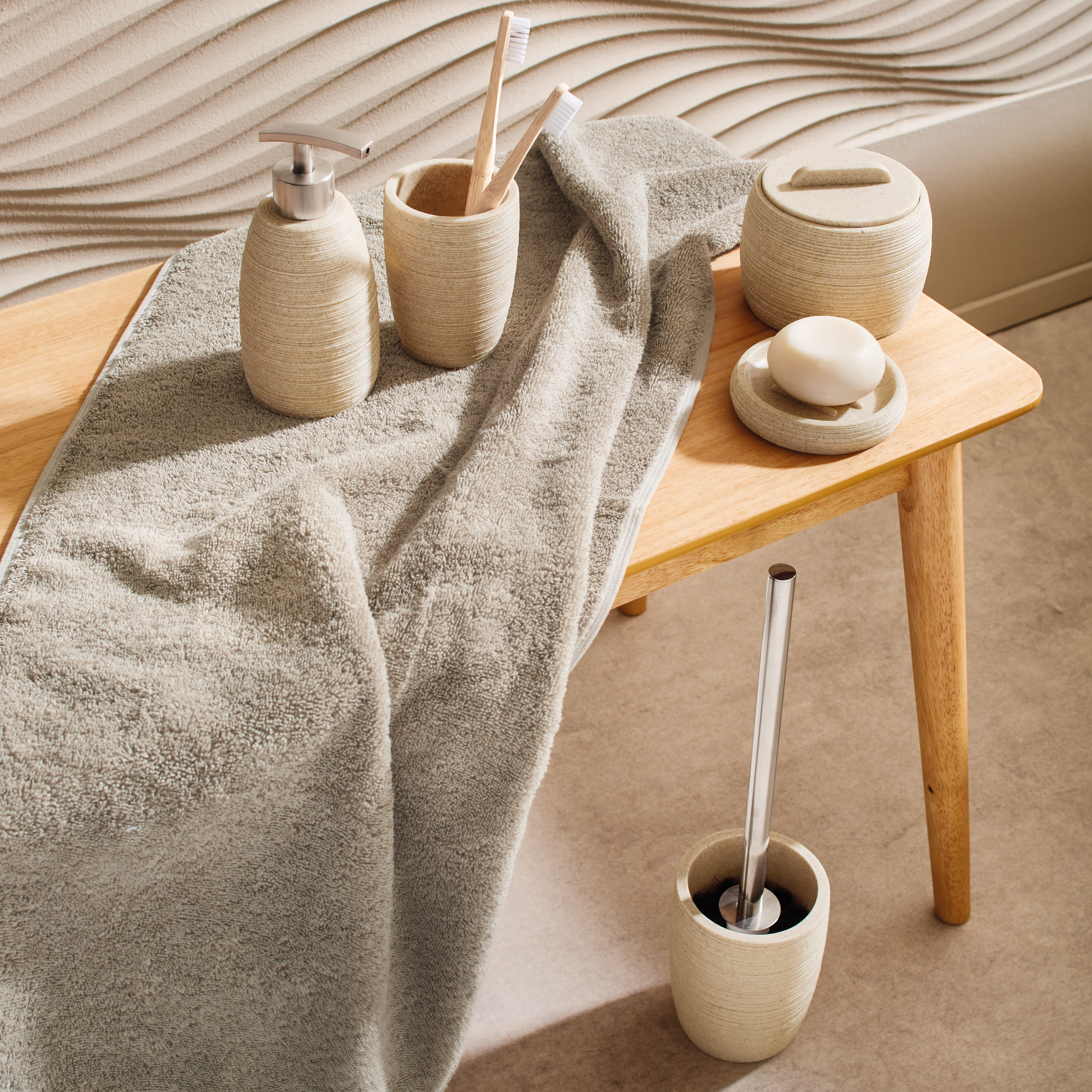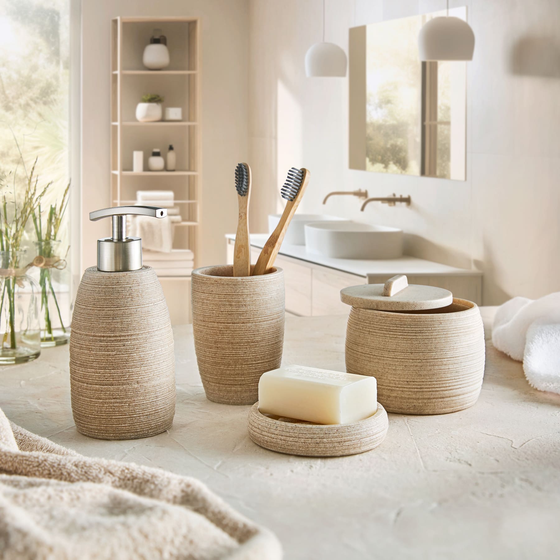 Entdecken Sie den stilvollen SAND Zahnputzbecher für Ihr Badezimmer, gefertigt aus umweltfreundlichem ECO Polyresin in der ansprechenden Farbe Macadamia. Dieses Modell zeichnet sich durch seine natürliche Rillenstruktur aus, die nicht nur optisch ansprechend ist, sondern auch eine praktische und hygienische Aufbewahrung Ihrer Zahnbürsten ermöglicht. Mit einer Größe von 7,5 cm in Breite und Tiefe sowie einer Höhe von 10 cm bietet der Becher ein Fassungsvermögen von etwa 250 ml. Der SAND Zahnputzbecher ist GRS-zertifiziert, was bestätigt, dass die Materialien nachhaltig und verantwortungsbewusst beschafft wurden. Bitte beachten Sie, dass dieser Becher nicht für die Spülmaschine geeignet ist und von Hand gereinigt werden sollte, um seine Qualität und Optik zu bewahren.